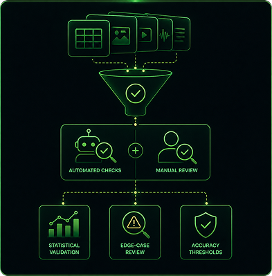 Every batch passes automated and manual QA checks. Statistical validation, edge-case review, and accuracy thresholds ensure datasets meet production requirements.